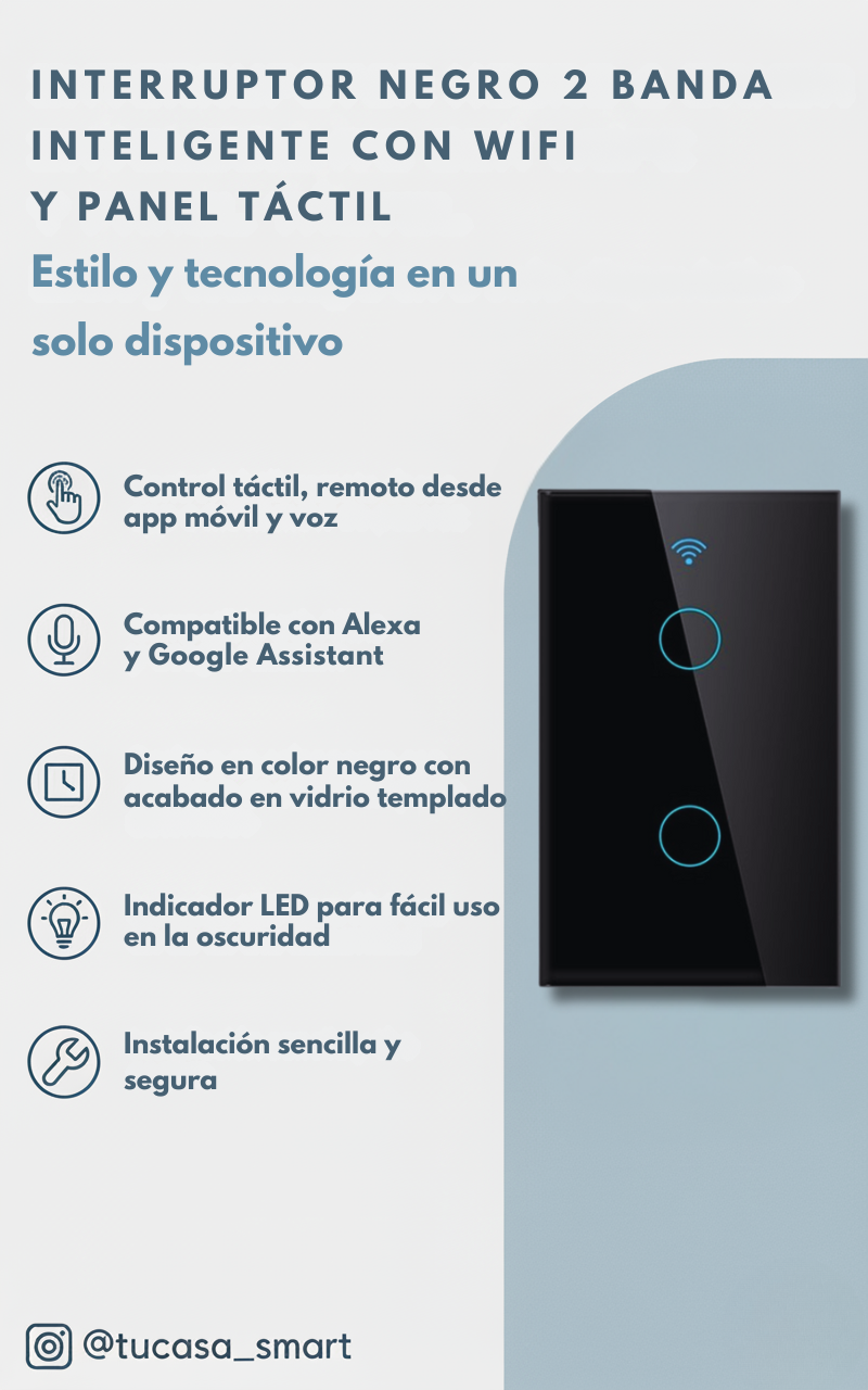 Automatiza tus espacios con el Interruptor Negro 2 Bandas Inteligente. Permite controlar dos luces de forma independiente desde su panel táctil, tu celular o mediante asistentes de voz como Alexa y Google Assistant. Su diseño en vidrio templado negro aporta un acabado elegante y resistente.