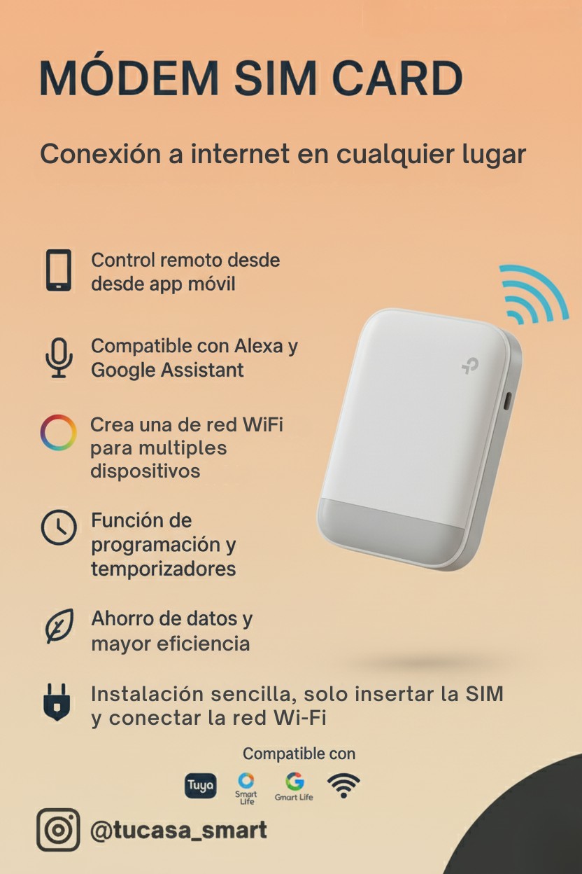 Mantente siempre conectado con el Módem SIM Card, una solución práctica para acceder a internet de alta velocidad sin necesidad de cables. Solo inserta tu tarjeta SIM y disfruta de una red WiFi estable para todos tus dispositivos, ideal para el hogar, la oficina o cuando viajas.