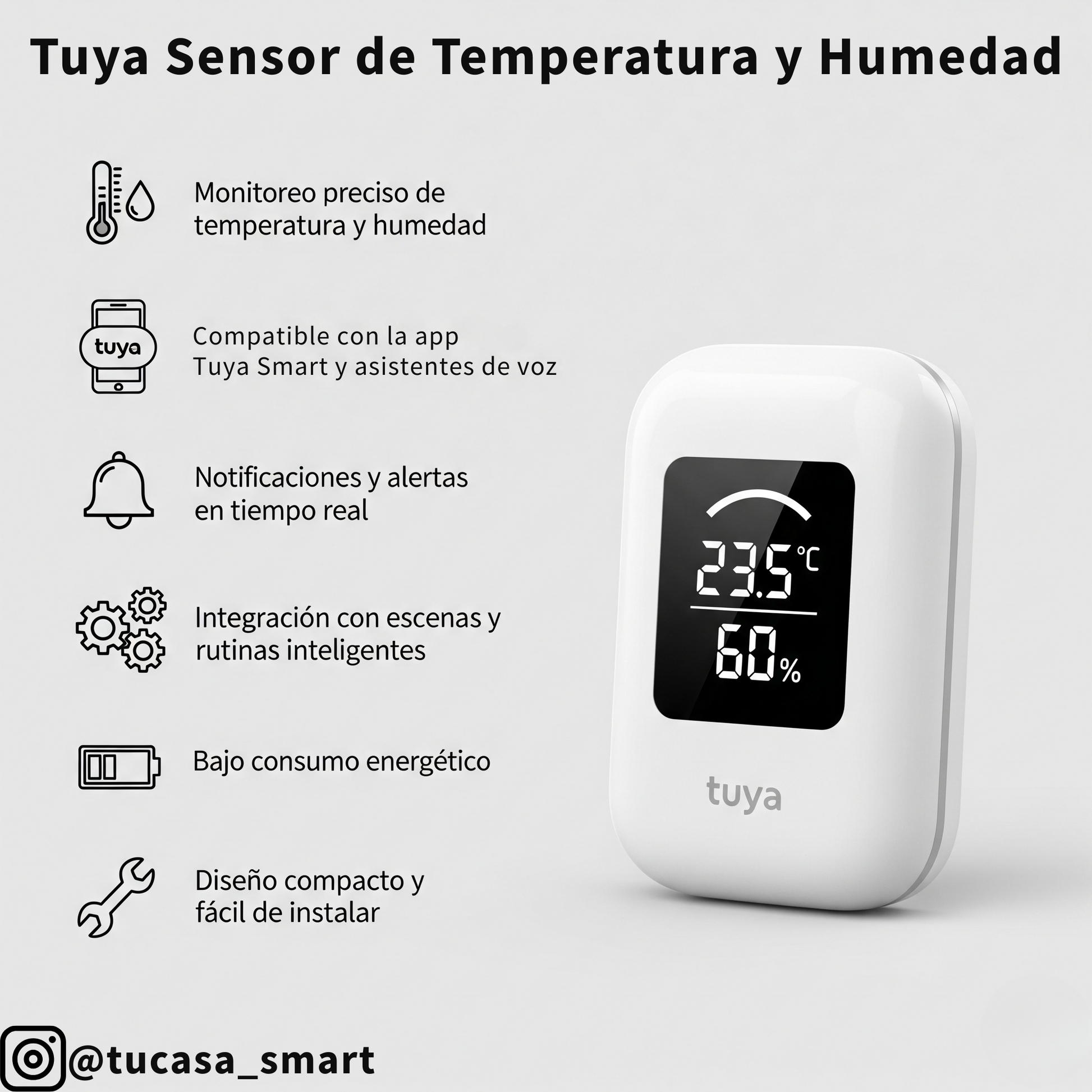 Controla el clima de tu hogar u oficina con el Tuya Sensor de Temperatura y Humedad. Mide en tiempo real tanto la temperatura como la humedad ambiental, permitiendo automatizar dispositivos como aires acondicionados, calefactores o humidificadores desde tu smartphone.