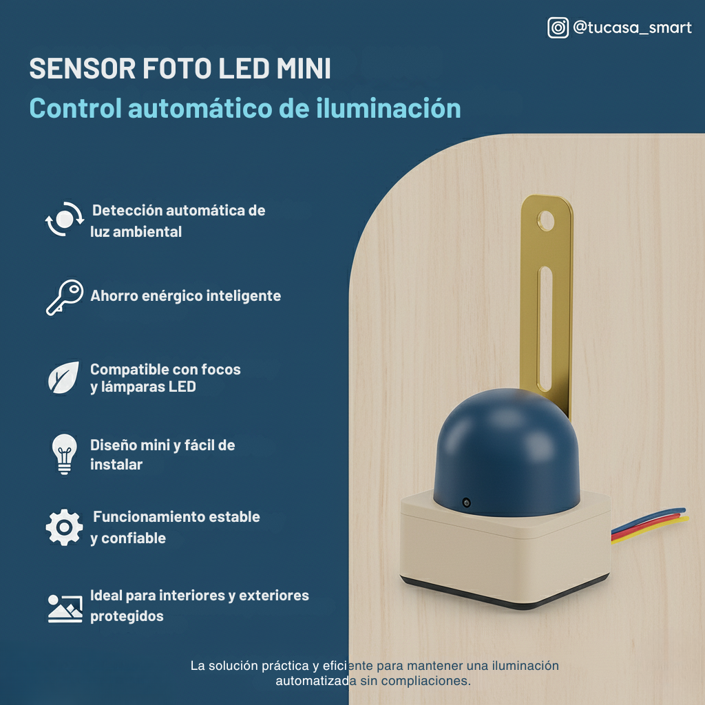 Optimiza el consumo de energía con el Sensor Foto LED Mini. Este dispositivo enciende o apaga automáticamente tus luces según la intensidad de la luz ambiental, asegurando que funcionen solo cuando realmente se necesitan. Su tamaño compacto lo hace ideal para instalaciones discretas en interiores o exteriores.